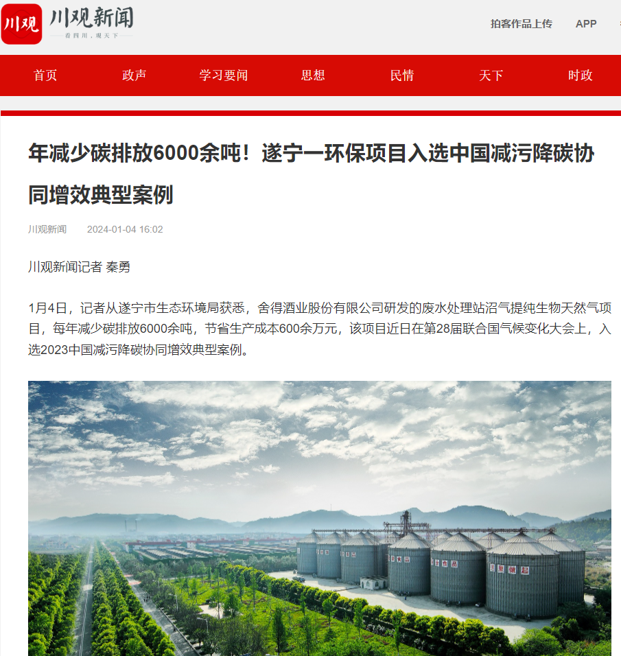 1月4日,记者从遂宁市生态环境局获悉,舍得酒业股份有限公司研发的废水处理站沼气提纯生物天然气项目,每年减少碳排放6000余吨,节省生产成本600余万元,该项目近日在第28届联合国气候变化大会上,入选2023中国减污降碳协同增效典型案例。