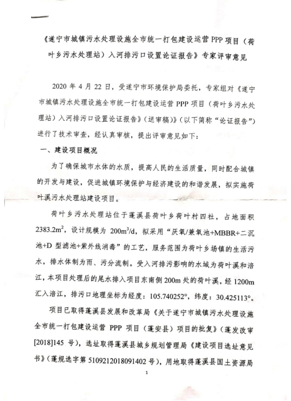 3.《遂宁市城镇污水处理设施全市统一打包建设运营PPP项目(荷叶乡污水处理站)入河排污口设置论证报告》专家评审意见
