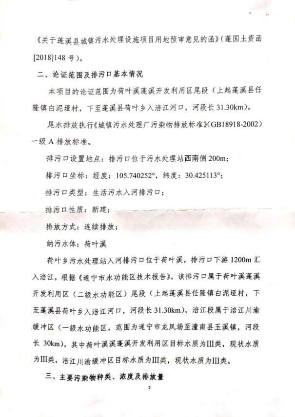 根据你单位提供的资料及入河排污口设置管理规定,同意你单位将处理达标的污水,排入项目南侧0.164km处的荷叶溪,但必须预留观察取样窗口。排污口地理坐标为经度:105°45′3.86″,纬度30°32′9.80″;废污水浓度及总量控制要求:最大污水排放量不超过800t/d,尾水排放执行《城镇污水处理厂污染物排放标准》(GB18918—2002)一级A排放标准,主要污染物排放浓度:化学需氧量≤50mg/l、氨氮≤5mg/l、总磷≤0.5mg/l,主要污染物排放总量:化学需氧量≤14.6t/a、氨氮≤1.46t/a、总磷≤0.146t/a。