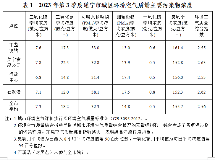 表1 2023年第3季度遂宁市城区环境空气质量主要污染物浓度