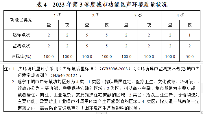 本季度,遂宁市各类功能区昼间噪声、夜间噪声监测点次达标率统计见表4。