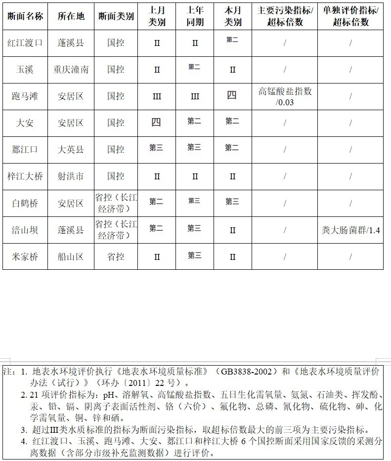 本月遂宁市9个国、省控地表水监测断面水环境质量状况见表2。