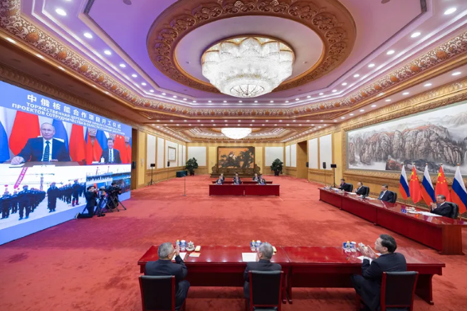 北京时间17时许,习近平抵达人民大会堂主会场,同在克里姆林宫主会场的普京互相挥手致意。