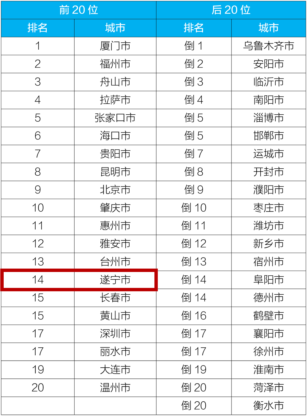 1月15日,生态环境部通报了2020年12月全国空气质量状况。值得一提的是,在2020年12月全国空气质量排名前20名的城市中,四川占据2席,分别是遂宁和雅安,具体排名分别为第14名和第12名。此外,在2020年1-12月全国空气质量排名前20名中,遂宁和雅安再度上榜,分别排名第18名和第12名。