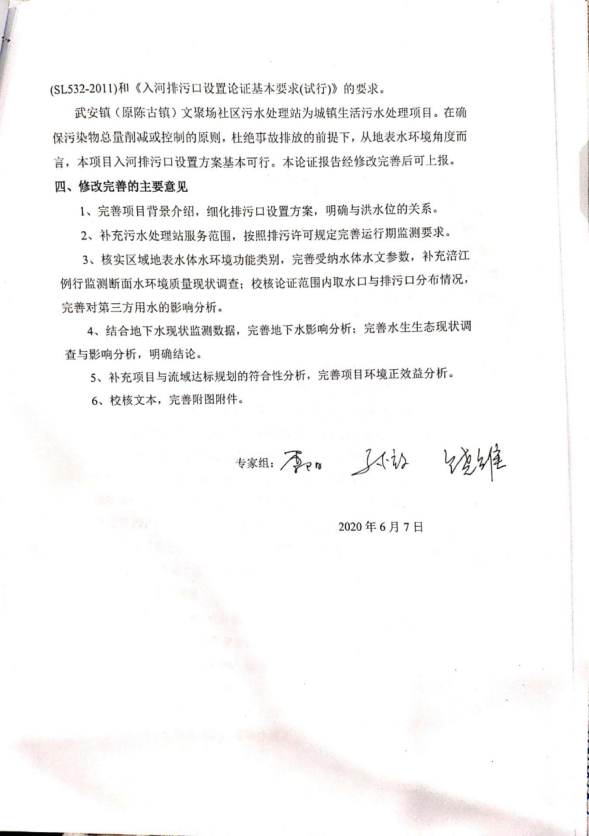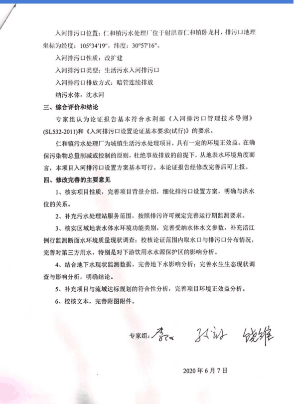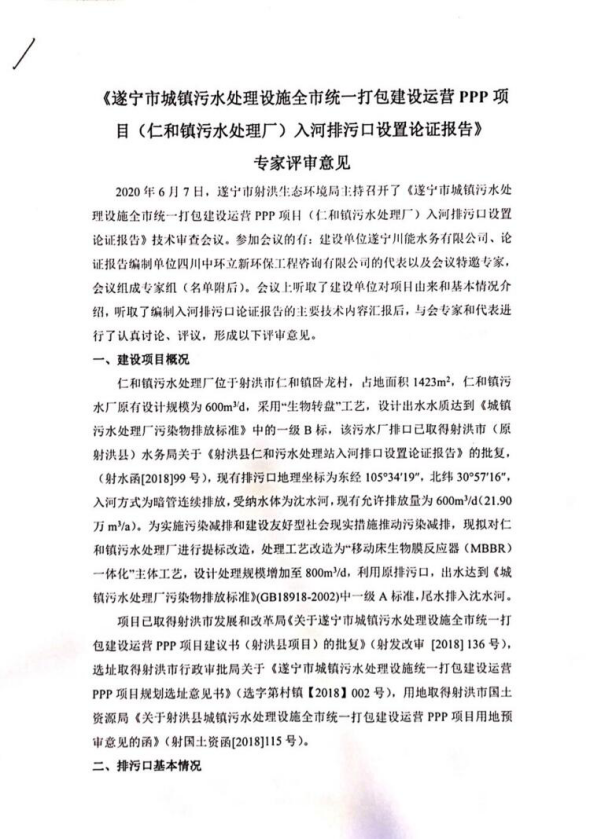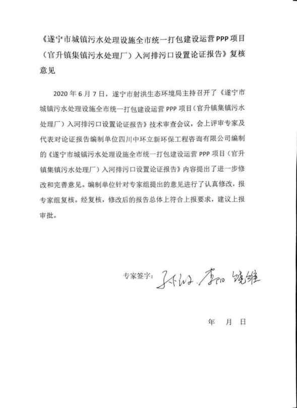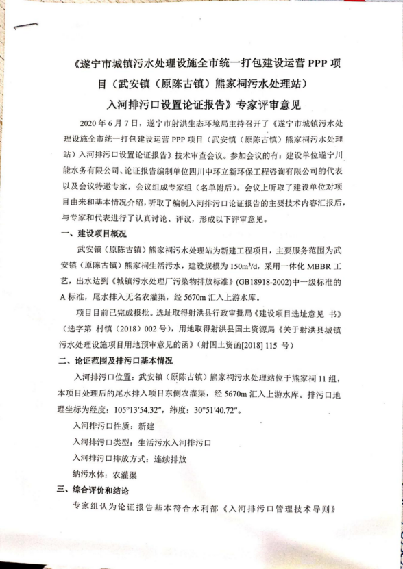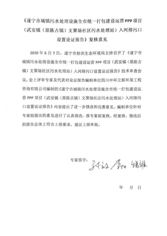 2020年6月7日,我局委托遂宁市射洪生态环境局主持召开了《遂宁市城镇污水处理设施全市统一打包建设营运PPP项目(官升镇、仁和镇、武安镇文聚场社区、武安镇熊家祠)入河排污口设置论证报告》技术审查会议。根据专家和参会人员审查意见,共经过2次全面修改,4个项目入河排污口基本符合设置管理要求,对受纳水域分析评价符合实际,对处理后的废水排放影响预测基本合理,结论基本可行(详见附件)。