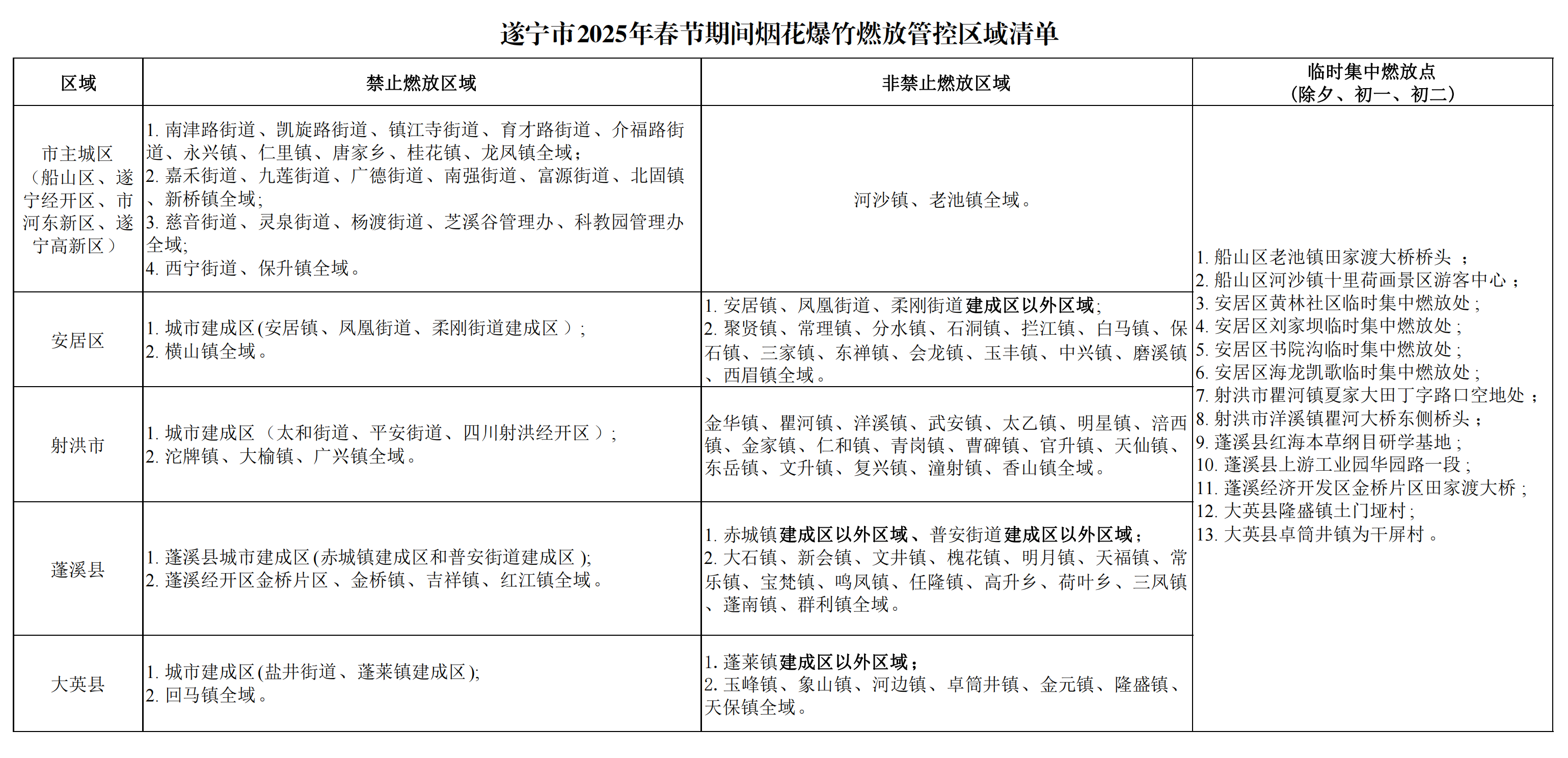 为营造安全环保、宁静祥和的节日环境,遂宁制定全市烟花爆竹燃放管控示意图,并梳理了全市烟花爆竹禁止燃放区域、临时集中燃放点以及非禁止燃放区域的详细清单。