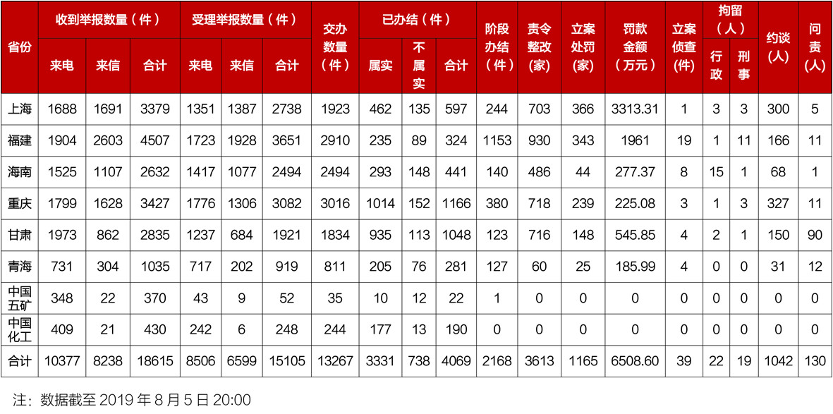 截至8月5日晚8:00,各督察组共收到群众来电、来信举报18615件,受理有效举报15105件,经梳理合并重复举报,累计向被督察地方和中央企业转办13267件,已办结4069件、阶段办结2168件。其中立案处罚1165家,罚款6508.60万元;立案侦查39件,拘留41人;约谈党政领导干部1042人,问责130人。从被督察地方和中央企业边督边改具体情况看,海南、福建、青海等地群众举报不实率较高,两家央企下属企业具体生态环境问题推动整改力度不够,需要引起重视。