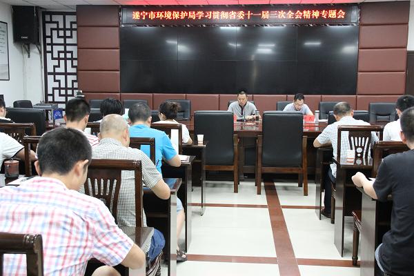 近日,遂宁市环保局召开全体干部职工学习会议,专题传达学习省委十一届三次全会精神。会议由局党组成员、副局长邹凯主持,县(区)环保局部分干部职工一同参加会议。