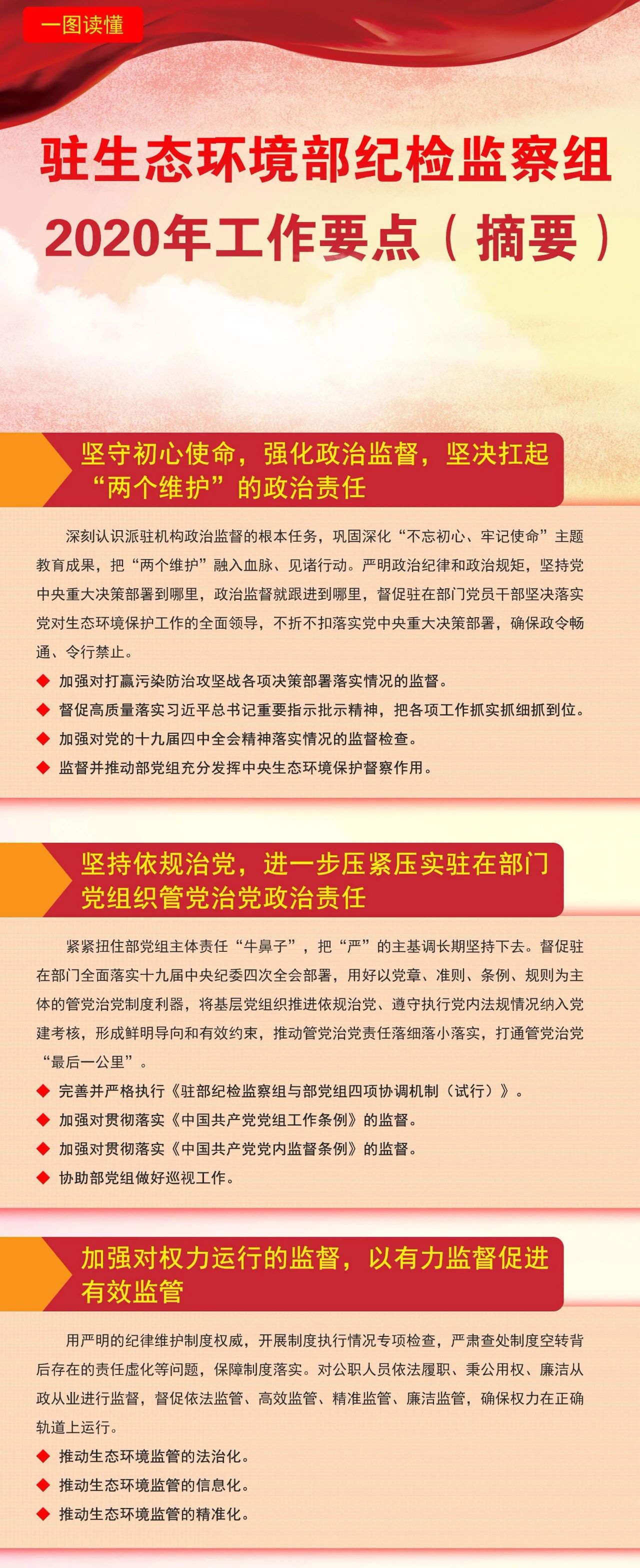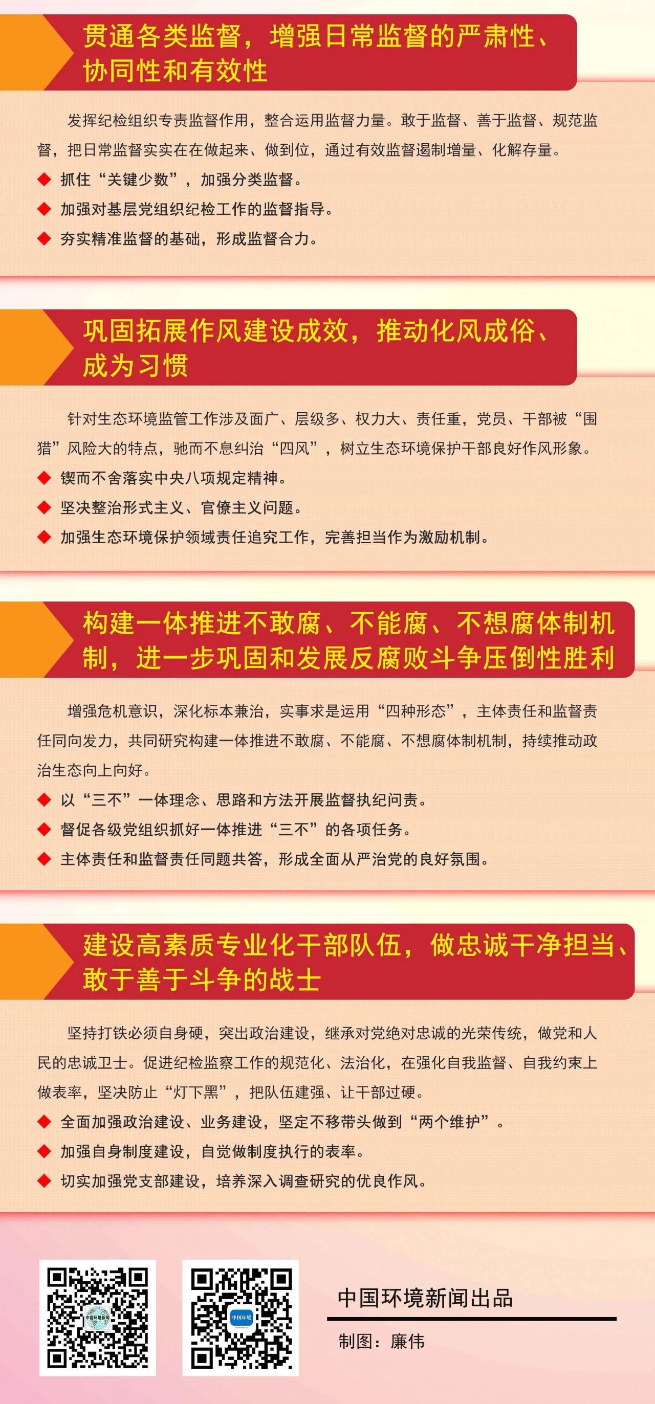 中央纪委国家监委驻生态环境部纪检监察组(以下简称驻部纪检监察组)要以习近平新时代中国特色社会主义思想为指导,深入贯彻党的十九大和十九届二中、三中、四中全会精神,认真落实十九届中央纪委四次全会部署和深化派驻机构改革要求,增强"四个意识"、坚定"四个自信"、做到"两个维护",坚守政治监督职责,坚持稳中求进工作总基调,强化对权力运行的制约和监督,一体推进不敢腐、不能腐、不想腐,推动驻在部门全面从严治党向纵深发展,在坚持和完善中国特色社会主义制度、推进生态环境治理体系和治理能力现代化中充分发挥监督保障执行、促进完善发展作用,为决胜全面建成小康社会、打赢污染防治攻坚战提供坚强保障。