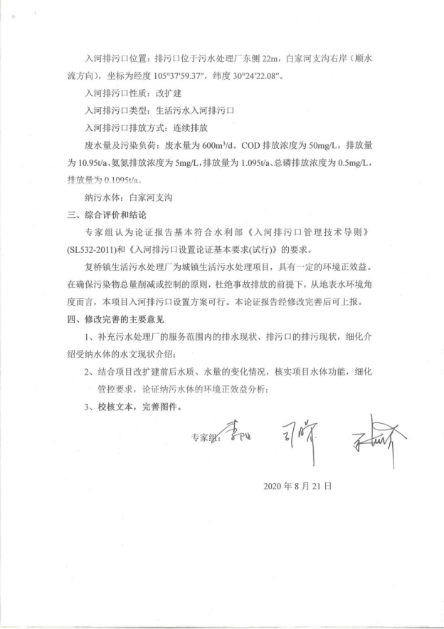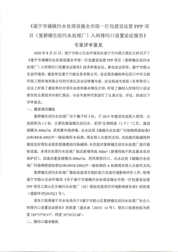 附件:《遂宁市城镇污水处理设施全市统一打包建设运营PPP项目(复桥镇生活污水处理厂)入河排污口设置论证报告》专家评审意见