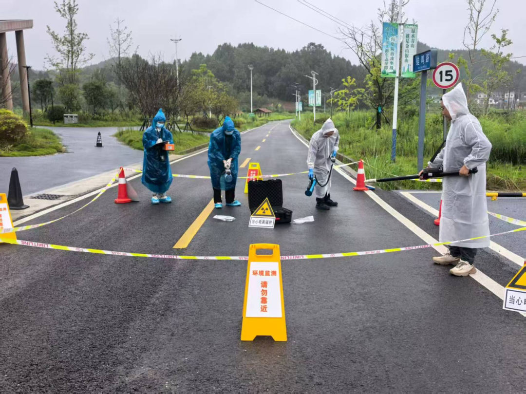 事故发生后,两地迅速启动应急监测预案,监测技术团队第一时间赶赴现场。为做好跨区域应急监测工作,两地驻市(州)站与辖区属地站迅速成立联合应急指挥部,统一指挥调度环境应急监测人员。根据赤溪流速水文条件及水系特点,在事故点下游布设多个监测断面,常规组对水质石油类含量进行实时监测,同时,辐射组监测事故车辆周边辐射状况并划定警戒区域,对警戒区内开展辐射监测,判断放射源状况,收贮散落放射源,确认辐射事故现场环境安全。