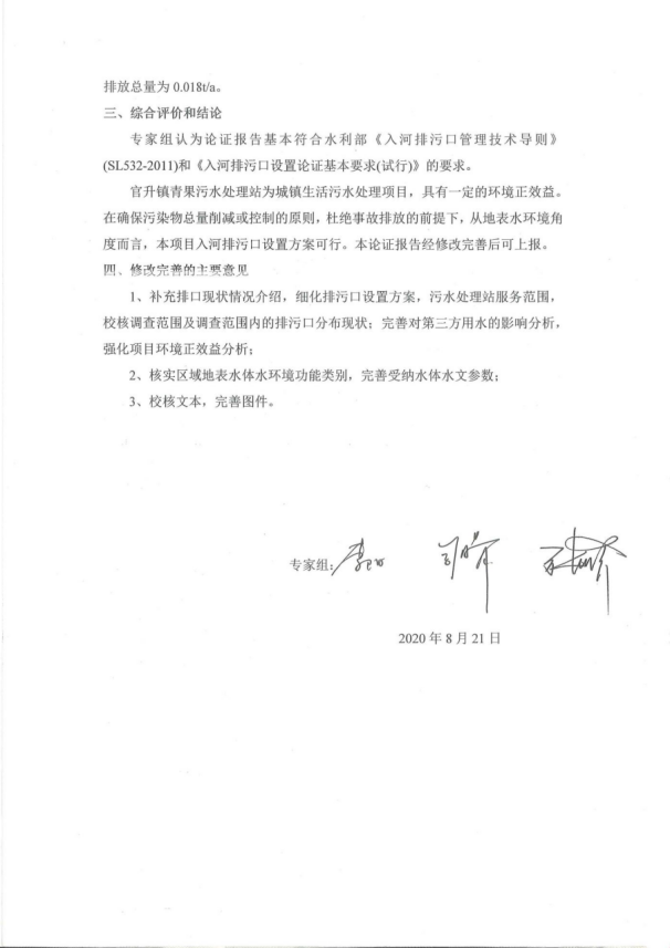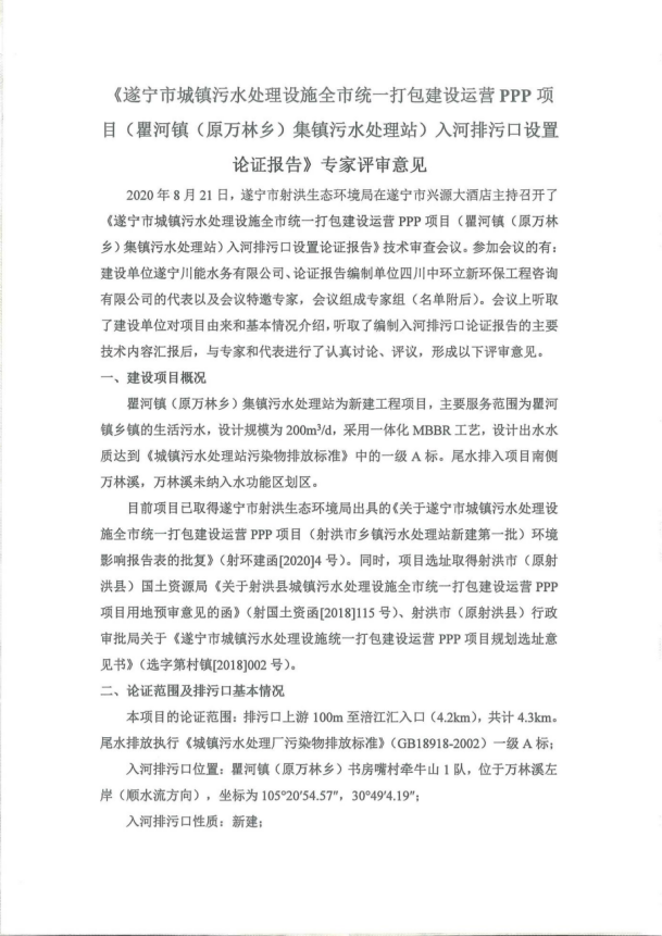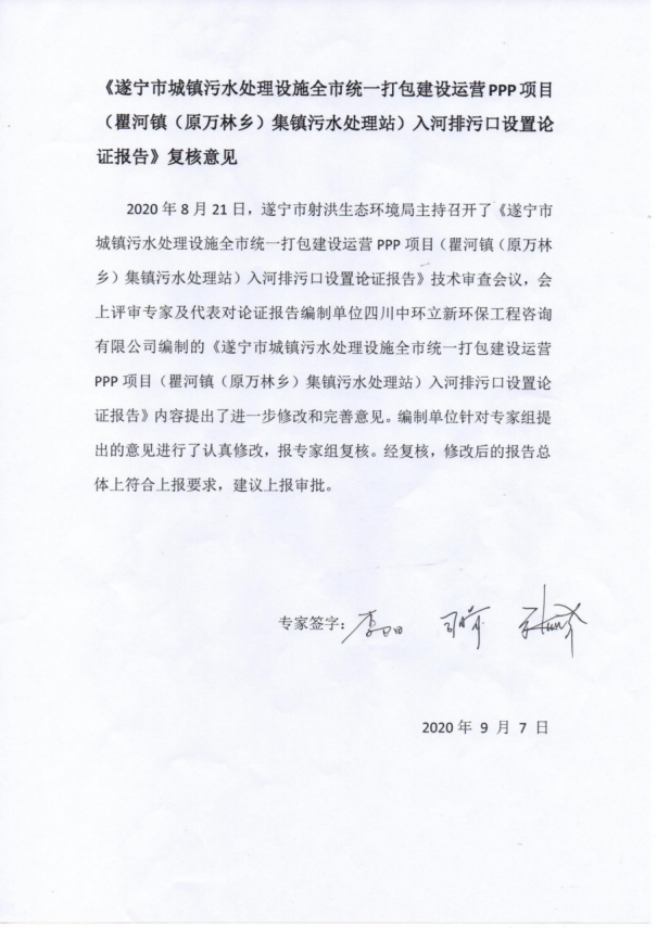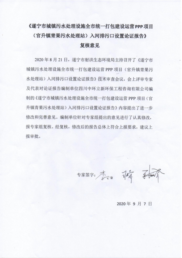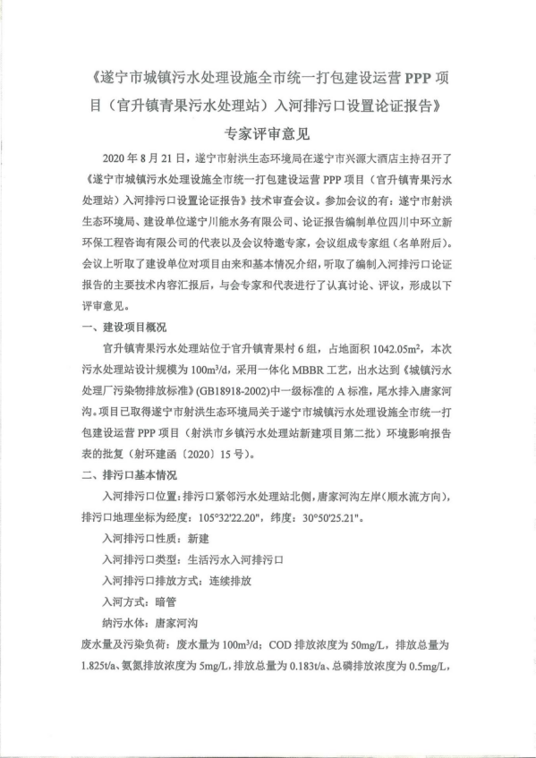 2.《遂宁市城镇污水处理设施全市统一打包建设运营PPP项目(官升镇青果污水处理站)入河排污口设置论证报告》专家评审、复核意见