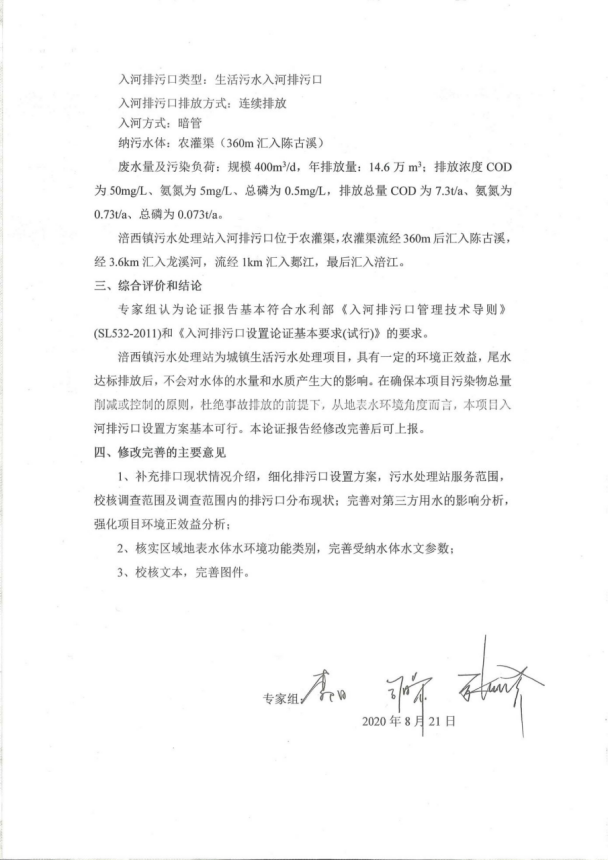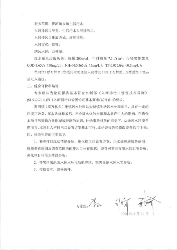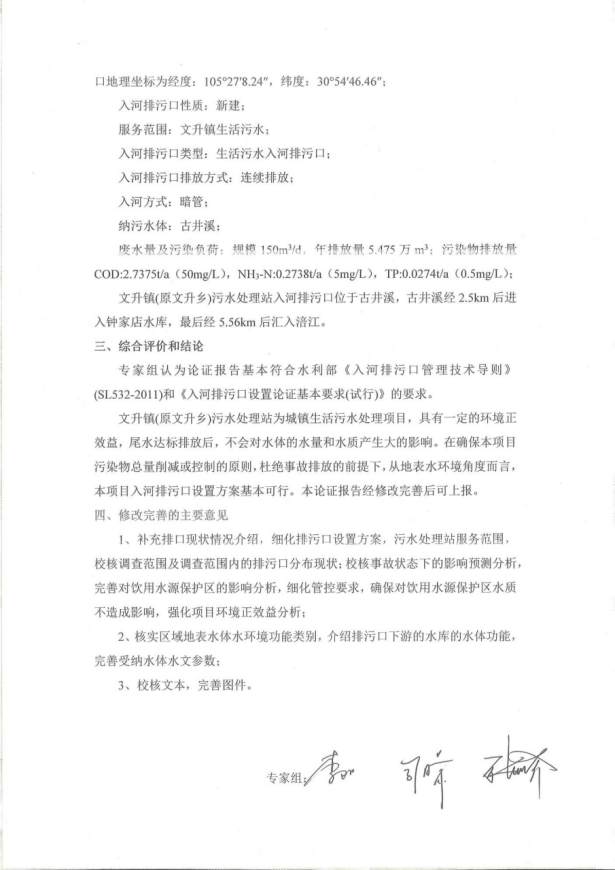 文升乡)污水处理站)入河排污口设置论证报告》技术审查会议。根据专家和参会人员审查意见,经过1次全面修改,项目入河排污口基本符合设置管理要求,对受纳水域分析评价基本符合实际,对处理后的废水排放影响预测基本合理,结论基本可行(详见附件)。