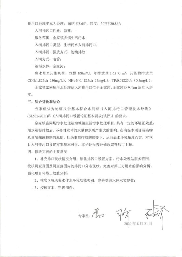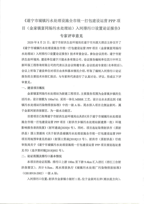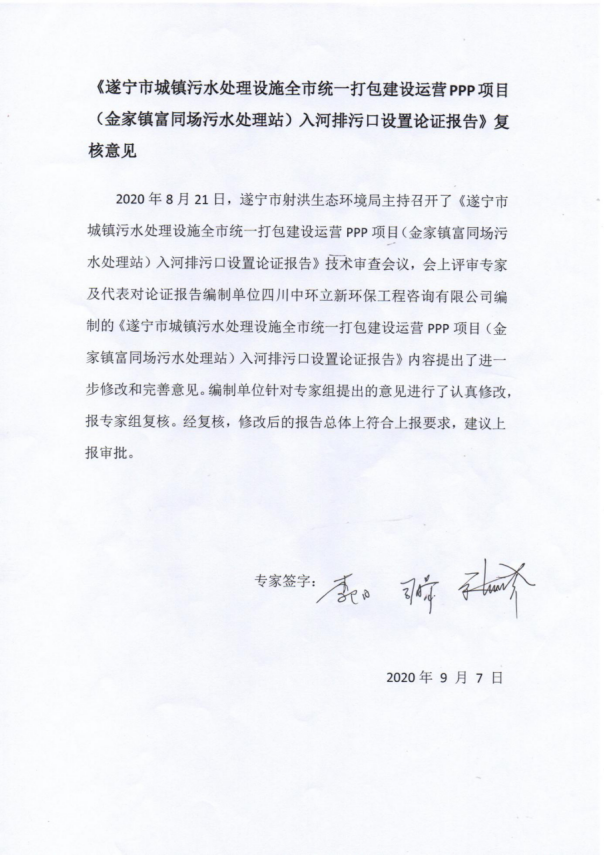 3.《遂宁市城镇污水处理设施全市统一打包建设运营PPP项目(金家镇富同场污水处理站)入河排污口设置论证报告》专家评审、复核意见