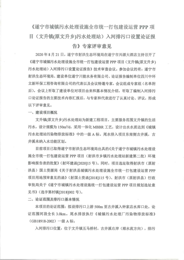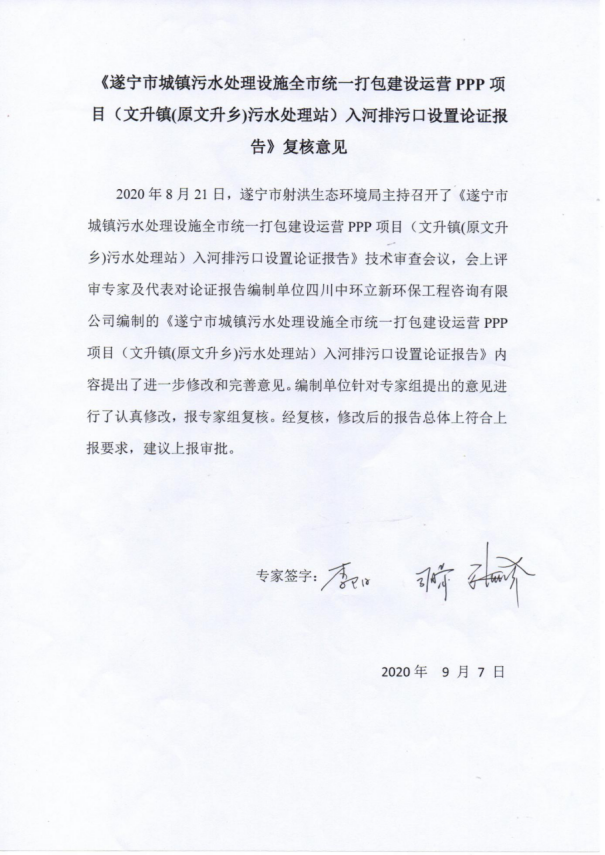 5.《遂宁市城镇污水处理设施全市统一打包建设运营PPP项目(文升镇(原文升乡)污水处理站)入河排污口设置论证报告》专家评评审、复核意见
