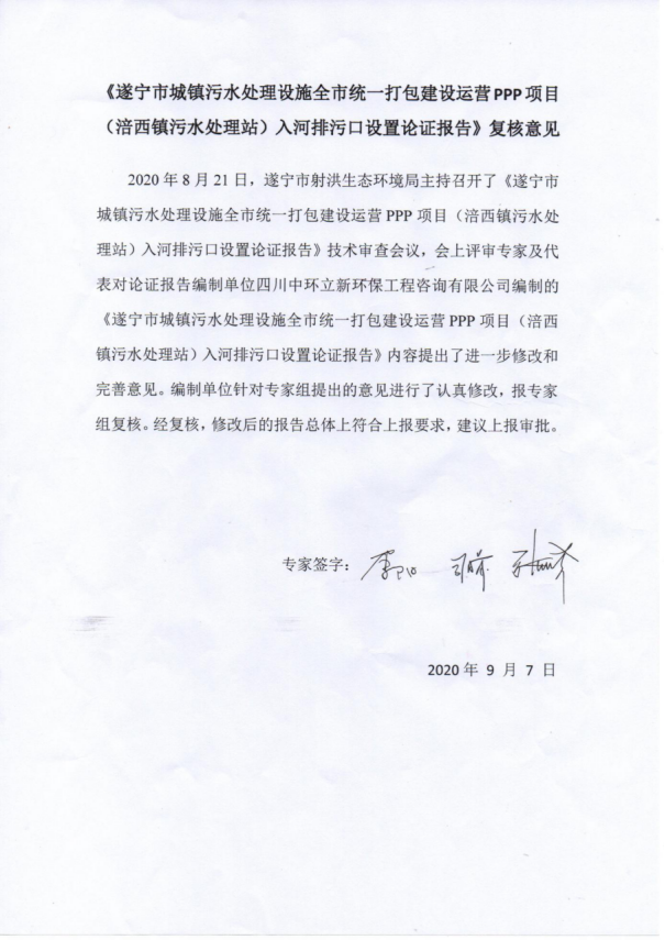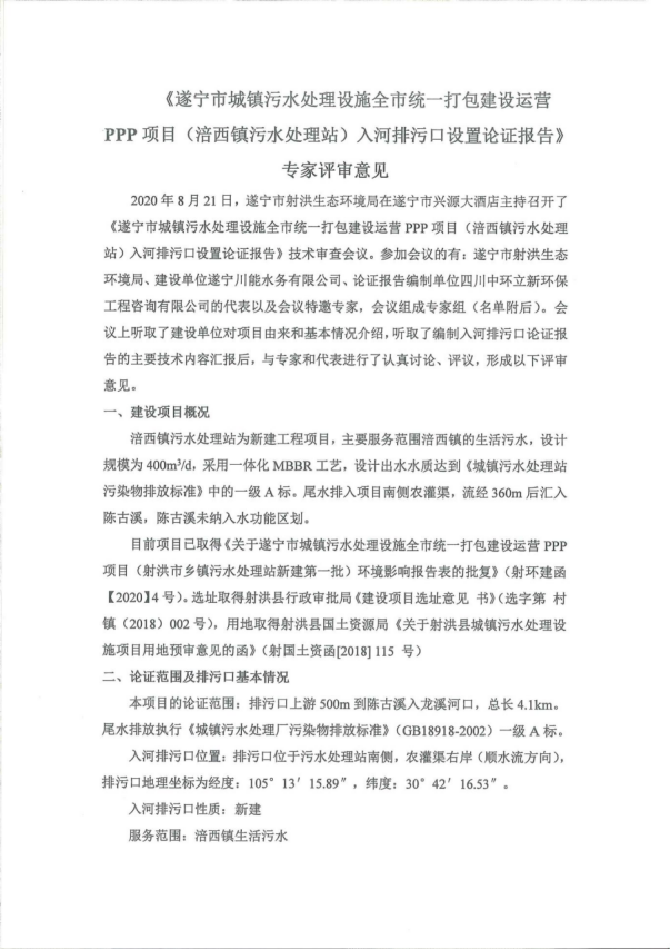 附件:1.《遂宁市城镇污水处理设施全市统一打包建设运营PPP项目(涪西镇污水处理站)入河排污口设置论证报告》专家评审、复核意见