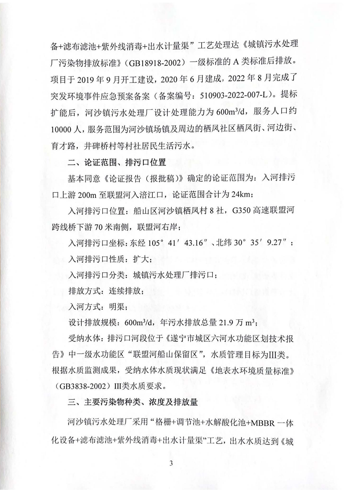 原则同意河沙镇生活污水处理厂扩大入河排污口,本项目处理后的尾水采用明渠方式排入联盟河。排污口地理坐标为经度:东经:105°41′43.16″,纬度:北纬30°35′9.27″;入河排污口类型:城镇污水处理厂排污口;排放方式:连续排放。该项目最大污水排放量不超过600m3/d,尾水排放执行《城镇污水处理厂污染物排放标准》(GB18918-2002)一级A排放标准,主要污染物排放浓度:化学需氧量≤50mg/L、氨氮≤5mg/L、五日生化需氧量≤10mg/L、总磷≤0.5mg/L、总氮≤15mg/L,主要污染物排放总量:化学需氧量≤10.95t/a、五日生化需氧量≤2.19t/a、氨氮≤1.095t/a、总磷≤0.1095t/a、总氮≤ 3.285t/a。