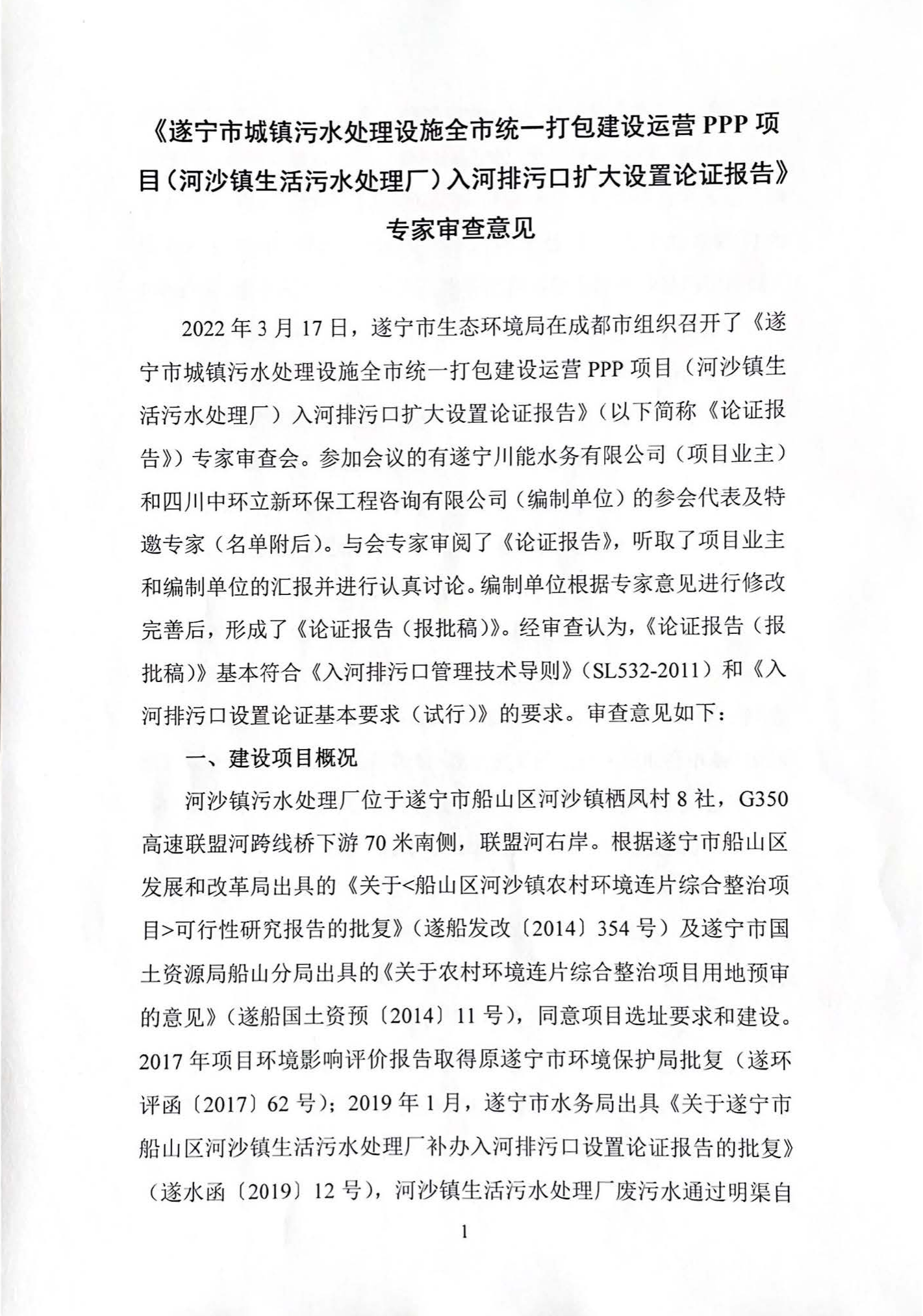 附件:《遂宁市城镇污水处理设施全市统一打包建设运营PPP项目(河沙镇生活污水处理厂)入河排污口扩大设置论证报告》专家审查意见